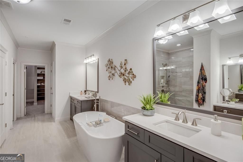 New Construction Townhome in the Heart of Downtown Senoia. Experience elevated living in this beautifully designed three-story townhome by JW Collection-The Seneca, ideally located within walking distance to the shops, restaurants, and vibrant entertainment of Downtown Senoia-all just 40 minutes from Hartsfield-Jackson Atlanta International Airport. Spacious & thoughtfully designed Interiors over 3,220 square feet of expertly crafted living space, this townhome is perfect for those seeking a blend of luxury, comfort, and convenience. Street-Level Entry. Step inside from the charming streetscape into a private two-car garage with additional golf cart parking, a bedroom with full bath, and a flex space ideal for a home office, gym, or media room. Main Level - Designed for Entertaining..The open-concept second floor features a great room with a fireplace, dining area, and a keeping room that seamlessly flows to a covered 10' x 12' deck-perfect for indoor/outdoor entertaining. The gourmet kitchen is a chef's dream, complete with Stainless steel KitchenAid appliances, Gas cooktop with custom wood venthood, Quartz countertops, Walk-in pantry with custom wooden shelving and a stylish powder room completes this level. Top Floor - Private Retreat...Upstairs, the owner's suite impresses with a spa-inspired bath, featuring a large, tiled shower, dual quartz vanities, and a custom walk-in closet system. Also on this level are a secondary bedroom with full bath, a versatile media room, and a private 24' x 10' rooftop sky terrace with spectacular views of the Gin Property neighborhood and Senoia's historic charm. The home's classic exterior blends timeless elegance with modern materials, including brick and Hardie plank siding. Every detail reflects the JW Collection's commitment to quality craftsmanship and design excellence. Don't miss your opportunity to own a luxury townhome in one of Georgia's most picturesque and walkable communities. Interior photos shown are representative of finishes from a similar community and not of the actual unit. Construction complete in April!