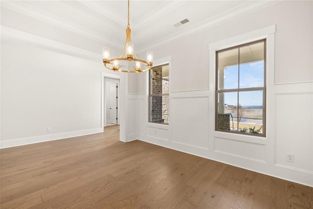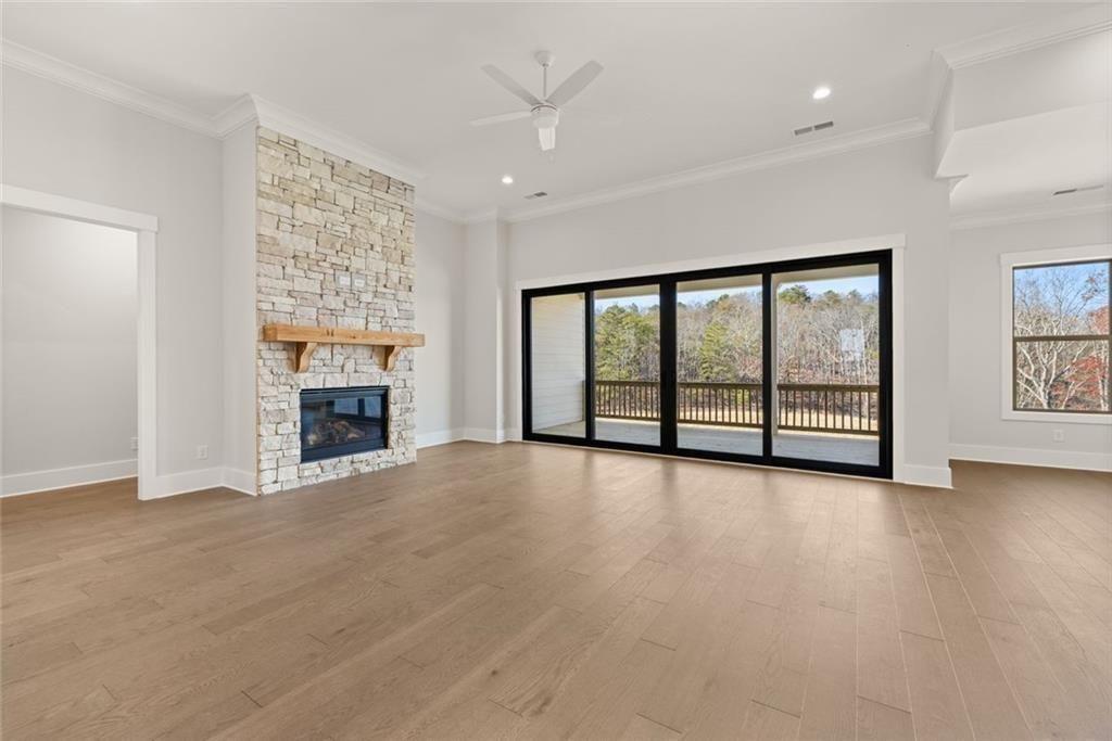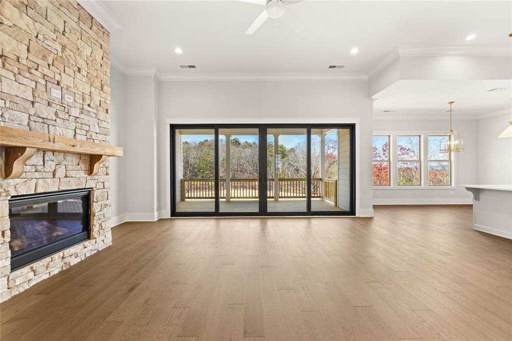 Introducing the final opportunity to own the highly coveted Wellington floor plan in Horizon at Laurel Canyon. This impressive ranch-style residence offers true one-level living on over an acre, featuring a beautifully level backyard that opens to serene wooded views-providing exceptional privacy and tranquility. Perfectly positioned at the top of the mountain, this is one of the community's most desirable flat homesites. Inside, the thoughtfully designed layout offers effortless flow with 3 bedrooms, 2.5 baths, and a spacious office or study. The guest bedrooms and full bath are privately situated on the opposite side of the home from the primary suite and study, ensuring comfort and seclusion for family and overnight guests alike. The formal dining room showcases timeless elegance with detailed wainscoting and a tray ceiling. The expansive family room serves as a stunning focal point, highlighted by a soaring stone fireplace with gas logs and starter-perfect for cozy evenings and gatherings. Designed for both everyday living and entertaining, the kitchen and breakfast area feature a large island ideal for casual dining and hosting. Step outside to the covered back porch and take in the breathtaking wooded backdrop-your own private outdoor retreat, perfect for morning coffee, evening relaxation, or alfresco dining. The walk-out full basement offers endless possibilities for future expansion, whether you envision additional living space, a home theater, game room, fitness area, or abundant storage. Exterior landscape lighting enhances the home's curb appeal and creates a warm, sophisticated ambiance after sunset.